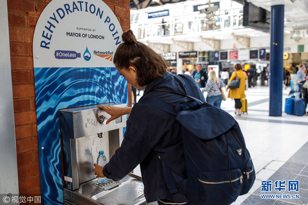 當(dāng)?shù)貢r(shí)間2018年8月28日,英國(guó)倫敦,民眾在公共飲水機(jī)旁飲水。倫敦市長(zhǎng)近日引進(jìn)了20個(gè)新的公共飲水機(jī),鼓勵(lì)人們自帶杯子取水喝,從而減少塑料垃圾。 (圖片來(lái)源:視覺中國(guó))
