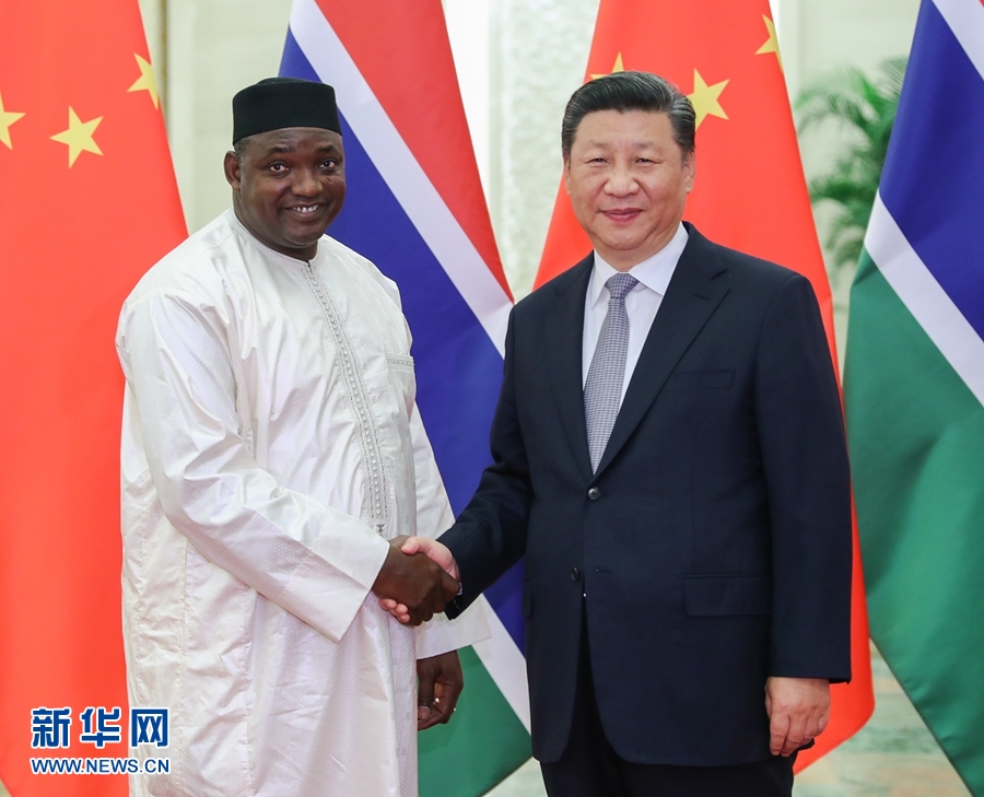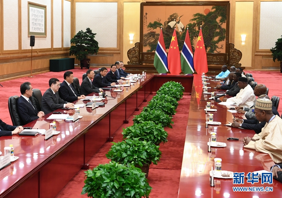 習近平歡迎岡比亞總統首次出席中非合作論壇會議,指出這對中岡關系、中非關系、論壇建設均具有重要意義。習近平強調,中岡復交2年多來,雙方友好合作全面、順利推進,雙邊關系發(fā)展得很好、很快,中方對兩國關系發(fā)展取得的成果感到滿意。中方贊賞總統先生和岡比亞政府堅持一個中國原則,愿同岡方繼續(xù)把握好兩國關系的大方向,不斷增進政治互信,繼續(xù)在涉及彼此核心利益和重大關切問題上相互堅定支持。中方支持岡比亞政府“建設新岡比亞”的努力,愿加強務實合作,擴大人文交流。中方支持岡方加強和平安全能力建設。