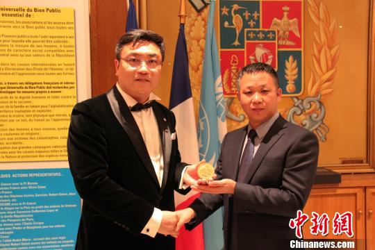 9月21日晚,中國工筆畫家崔景哲(左)在巴黎榮獲全球公益聯(lián)盟文學(xué)(藝術(shù))金質(zhì)勛章,也是此次頒獎典禮所有獲獎?wù)咧形ㄒ灰晃恢袊?。江蘇凱旋體育文化董事長吳愛華等知名人士對崔景哲的獲獎表示祝賀。李洋 攝