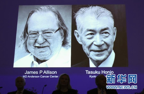 10月1日,在瑞典斯德哥爾摩卡羅琳醫(yī)學(xué)院舉行的新聞發(fā)布會(huì)現(xiàn)場(chǎng),大屏幕顯示美國(guó)科學(xué)家詹姆斯·艾利森(左)和日本科學(xué)家本庶佑的照片。 新華社記者葉平凡攝