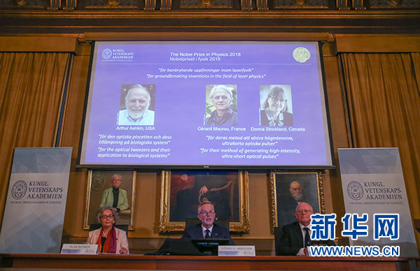 10月2日,瑞典皇家科學院在斯德哥爾摩舉行新聞發(fā)布會,公布2018年諾貝爾物理學獎獲得者。新華社記者 葉平凡 攝