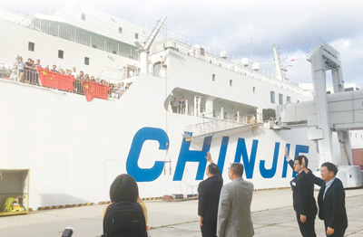 9月10日,中國駐大阪總領(lǐng)館工作人員把因臺(tái)風(fēng)滯留日本關(guān)西國際機(jī)場(chǎng)的部分中國旅客送上助其返鄉(xiāng)的“新鑒真”號(hào)。資料圖片