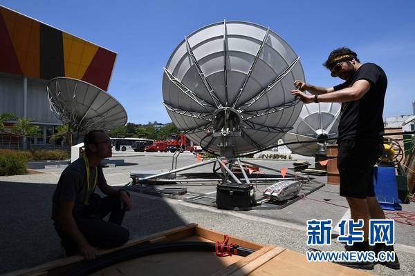 11月13日,工作人員在巴布亞新幾內亞首都莫爾茲比港的APEC國際媒體中心安裝衛(wèi)星設備。 新華社記者呂小煒攝