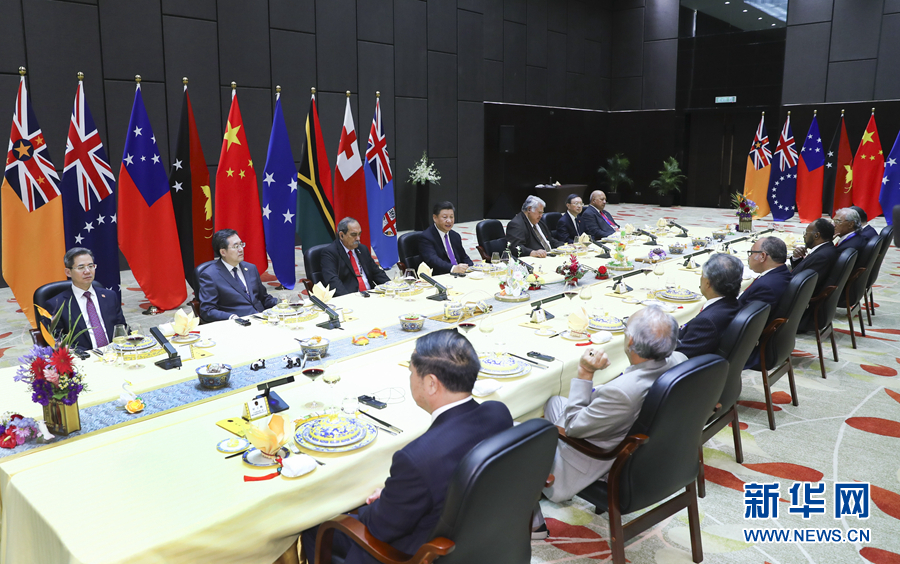 11月16日,國家主席習近平在莫爾茲比港同巴布亞新幾內亞總理奧尼爾、密克羅尼西亞聯(lián)邦總統(tǒng)克里斯琴、薩摩亞總理圖伊拉埃帕、瓦努阿圖總理薩爾瓦伊、庫克群島總理普納、湯加首相波希瓦、紐埃總理塔拉吉等建交太平洋島國領導人以及斐濟政府代表、國防部長昆布安博拉舉行集體會晤。習近平主持會晤并發(fā)表主旨講話。 新華社記者 謝環(huán)馳 攝