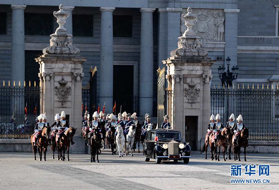 習(xí)近平和夫人彭麗媛乘皇家禮車在身著禮服、騎著高頭大馬的西班牙皇家衛(wèi)隊騎兵護衛(wèi)下,前往武器廣場。抵達時,鼓樂齊鳴,費利佩六世國王和萊蒂西婭王后上前迎接,互致問候。費利佩六世向習(xí)近平介紹王室高級官員。隨后,兩國元首夫婦一同登上檢閱臺。在21響禮炮聲中,軍樂團奏中國、西班牙兩國國歌。儀仗隊長趨前請習(xí)近平檢閱。習(xí)近平在費利佩六世國王陪同下依次檢閱步兵方隊、騎兵方隊和摩托車隊。習(xí)近平同西方陪同人員握手,費利佩六世國王同中方陪同人員握手。兩國元首夫婦返回檢閱臺,觀看分列式。在摩托車隊引領(lǐng)下,整齊的軍樂隊、雄赳赳的步兵方隊、威武的騎兵方隊依次通過檢閱臺。