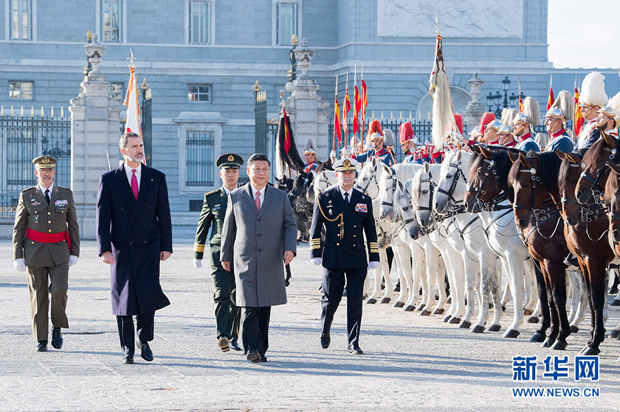 當?shù)貢r間11月28日,國家主席習(xí)近平在馬德里出席西班牙國王費利佩六世舉行的隆重、盛大的歡迎儀式。這是習(xí)近平在費利佩六世國王陪同下檢閱步兵方隊。 新華社記者 李學(xué)仁 攝