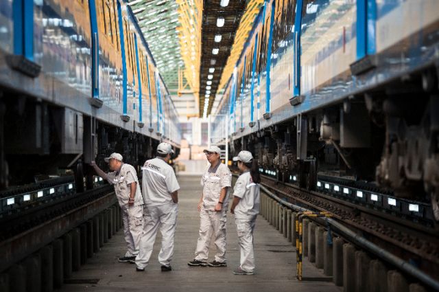 在布宜諾斯艾利斯以南的利亞瓦略爾,中阿技術人員共同檢查羅卡線城際鐵路上的列車。(馬丁·薩巴拉攝)
