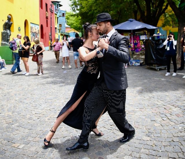 在布宜諾斯艾利斯市博卡區(qū),一對舞者當街跳起探戈。(新華社記者姚大偉攝)