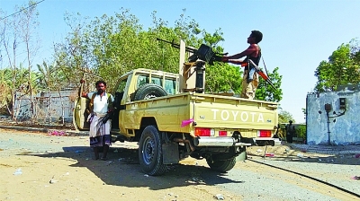 11月15日,在也門荷臺(tái)達(dá),支持也門政府的武裝人員在一輛軍車上。新華社發(fā)
