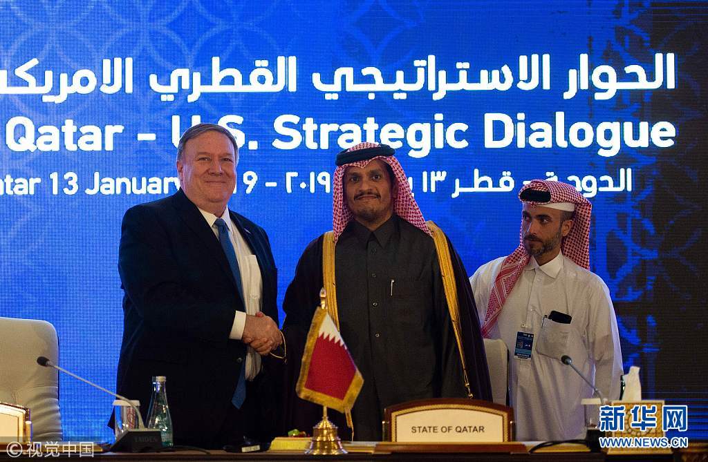 2019年1月13日,卡塔爾多哈,美國國務(wù)卿邁克·蓬佩奧訪問卡塔爾。蓬佩奧與卡塔爾副首相兼外交大臣穆罕默德在多哈的喜來登大酒店簽署了諒解備忘錄和意向聲明并舉行聯(lián)合記者會。蓬佩奧表示,兩國外交部門領(lǐng)導(dǎo)人當(dāng)天簽署了一份諒解備忘錄,將擴(kuò)建和改造烏代德美國空軍基地。(圖片來源:視覺中國)