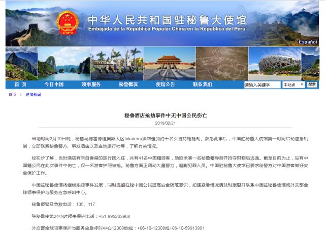 當(dāng)?shù)貢r(shí)間2月19日晚,秘魯馬德雷德迪奧斯大區(qū)Inkaterra酒店遭到約十名歹徒持槍搶劫。獲悉此事后,中國(guó)駐秘魯大使館第一時(shí)間啟動(dòng)應(yīng)急機(jī)制,立即聯(lián)系秘魯警方、事發(fā)酒店以及當(dāng)?shù)芈眯猩绲?,了解有關(guān)情況。