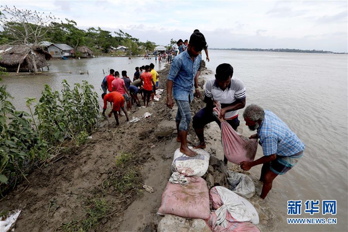5月4日,在孟加拉國庫爾納,人們修補(bǔ)沙袋路堤。新華社發(fā)