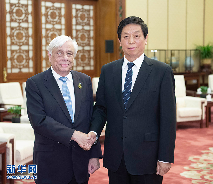 5月13日,全國人大常委會(huì)委員長栗戰(zhàn)書在北京人民大會(huì)堂會(huì)見希臘總統(tǒng)帕夫洛普洛斯。 新華社記者 李濤 攝