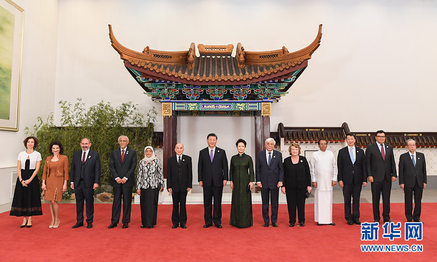 5月14日,國(guó)家主席習(xí)近平和夫人彭麗媛在北京人民大會(huì)堂舉行宴會(huì),歡迎出席亞洲文明對(duì)話大會(huì)的外方領(lǐng)導(dǎo)人夫婦及嘉賓。這是習(xí)近平和彭麗媛同外方領(lǐng)導(dǎo)人夫婦及嘉賓合影。 新華社記者 饒愛民 攝