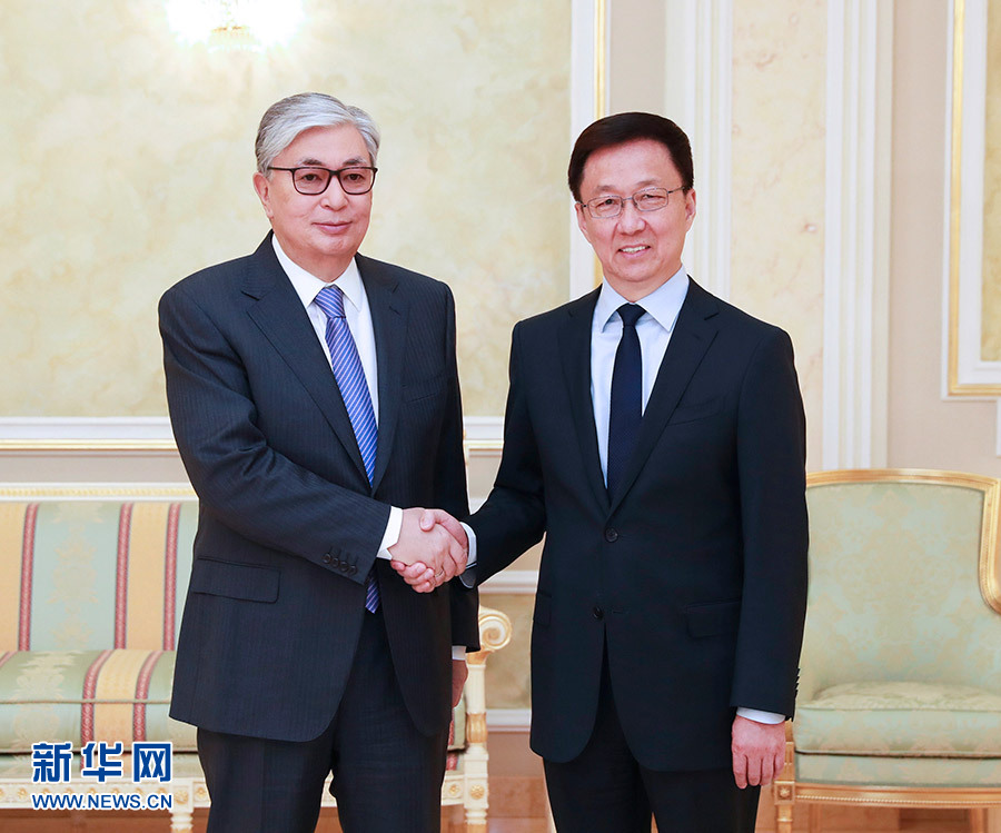 在會見托卡耶夫時,韓正首先轉(zhuǎn)達(dá)了習(xí)近平主席對托卡耶夫總統(tǒng)的親切問候。韓正說,在兩國元首的戰(zhàn)略引領(lǐng)和親自推動下,中哈全面戰(zhàn)略伙伴關(guān)系快速發(fā)展,雙方政治互信日益加深,各領(lǐng)域合作處于歷史最好水平,在地區(qū)乃至全世界樹立了睦鄰友好、互利共贏的典范。上個月習(xí)近平主席同納扎爾巴耶夫首任總統(tǒng)舉行了富有成果的會晤,向他頒授中華人民共和國“友誼勛章”,向國際社會展現(xiàn)了中哈關(guān)系的高水平和特殊性。共建“一帶一路”已成為中哈合作主線,雙方在發(fā)展戰(zhàn)略對接、合作機制建設(shè)、重大項目推進等方面碩果累累。中方愿與哈方一道,繼續(xù)深化絲綢之路經(jīng)濟帶與“光明之路”新經(jīng)濟政策對接,以產(chǎn)能、貿(mào)易、互聯(lián)互通、農(nóng)業(yè)、高技術(shù)、金融合作為優(yōu)先方向,不斷提升中哈合作含金量,更好地造福兩國和兩國人民。中方祝愿哈方順利實施“2050戰(zhàn)略”,在國家發(fā)展事業(yè)中不斷取得新的輝煌成就。