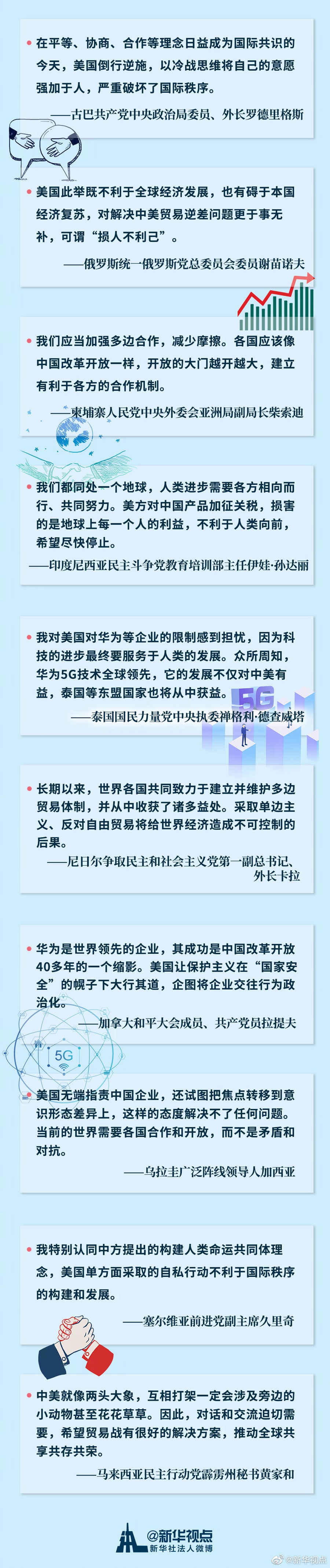 德不孤,必有鄰。針對美國近期揮舞加征關(guān)稅大棒、對華極限施壓并打壓中國企業(yè)的行為,近日參加中共中央對外聯(lián)絡(luò)部活動(dòng)的多名外賓在接受新華社記者采訪時(shí)紛紛發(fā)表看法,表達(dá)對中方的支持。聽聽他們怎么說。 ????