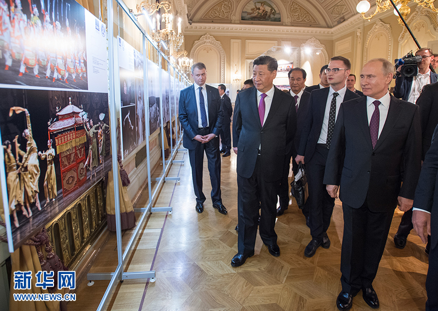 6月5日,國家主席習(xí)近平和俄羅斯總統(tǒng)普京在莫斯科大劇院共同出席中俄建交70周年紀(jì)念活動(dòng)。這是兩國元首共同參觀中俄建交70周年圖片展。 新華社記者 李學(xué)仁 攝