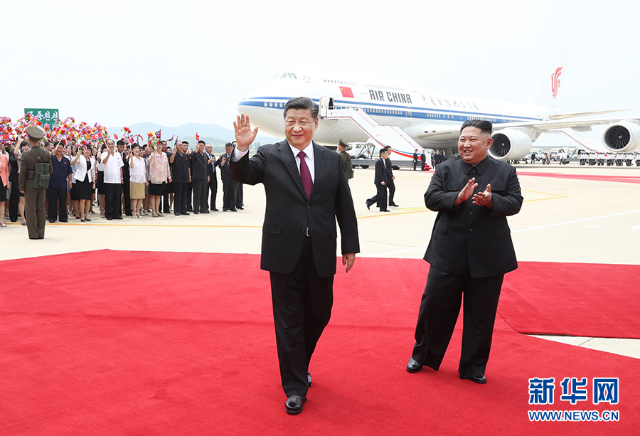 6月20日,中共中央總書記、國家主席習(xí)近平乘專機(jī)抵達(dá)平壤,開始對(duì)朝鮮民主主義人民共和國進(jìn)行國事訪問。朝鮮勞動(dòng)黨委員長、國務(wù)委員會(huì)委員長金正恩和夫人李雪主到機(jī)場熱情迎接習(xí)近平和夫人彭麗媛。朝方在機(jī)場舉行隆重歡迎儀式。 新華社記者 劉衛(wèi)兵 攝
