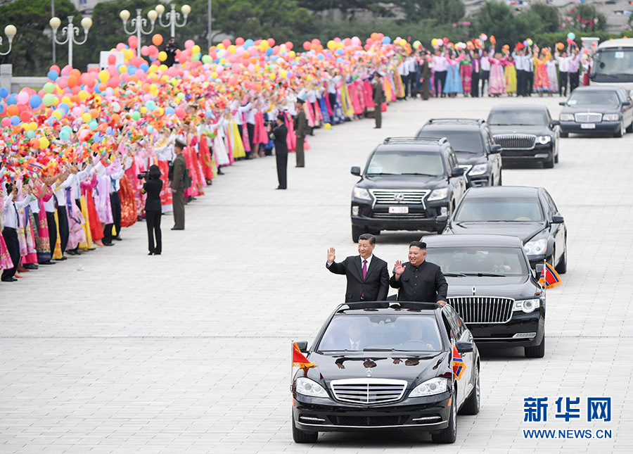 歡迎儀式結(jié)束后,在21輛禮賓摩托車的護(hù)衛(wèi)下,習(xí)近平乘車前往錦繡山迎賓館。沿途數(shù)十萬群眾揮舞中朝兩國國旗和五彩繽紛的鮮花,熱情洋溢地高呼中朝友誼萬歲等口號(hào),夾道歡迎。