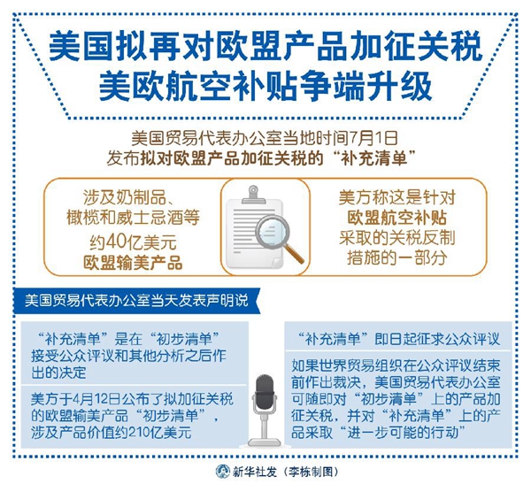 新華社華盛頓7月1日電(記者熊茂伶 鄧仙來)美國貿(mào)易代表辦公室1日發(fā)布擬對(duì)歐盟產(chǎn)品加征關(guān)稅的“補(bǔ)充清單”,涉及奶制品、橄欖和威士忌酒等約40億美元?dú)W盟輸美產(chǎn)品。美方稱這是針對(duì)歐盟航空補(bǔ)貼采取的關(guān)稅反制措施的一部分。