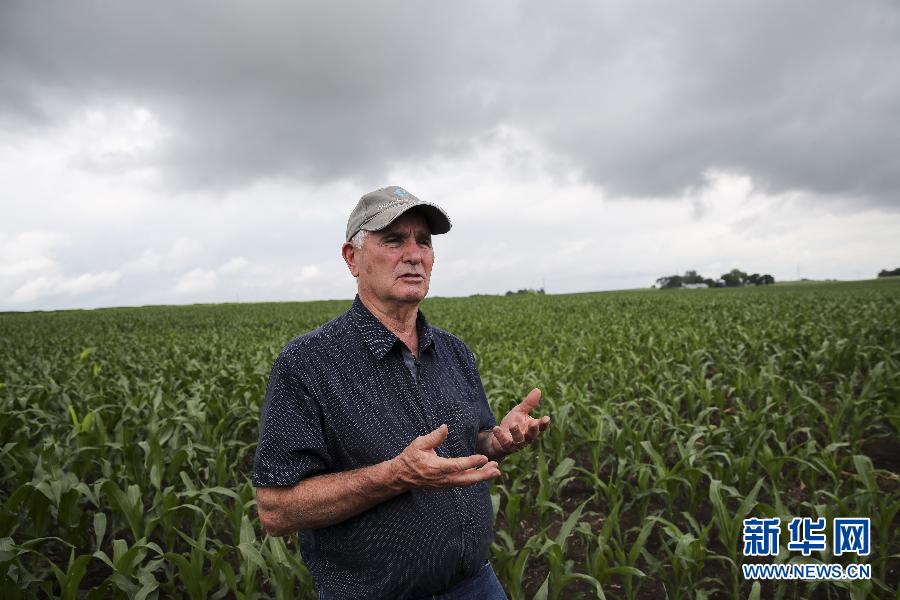 6月18日,在美國(guó)艾奧瓦州大西洋鎮(zhèn),農(nóng)場(chǎng)主比爾·佩雷特在自家的玉米地里接受采訪(fǎng)。?新華社記者 王迎 攝