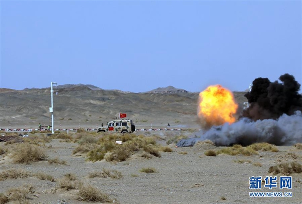在“國(guó)際軍事比賽-2019”“安全環(huán)境”項(xiàng)目單組賽中,中國(guó)參賽隊(duì)快速通過雷爆區(qū)(8月8日攝)。新華社發(fā)(王軍強(qiáng) 攝)