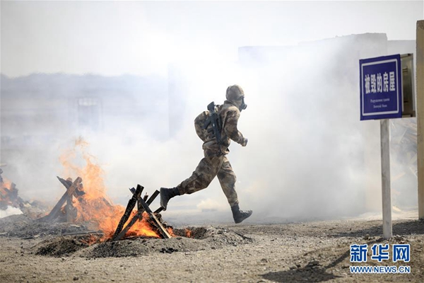 在“國(guó)際軍事比賽-2019”“安全環(huán)境”項(xiàng)目單組賽中,中國(guó)參賽隊(duì)員通過火障(8月8日攝)。新華社發(fā)(王鵬飛 攝)