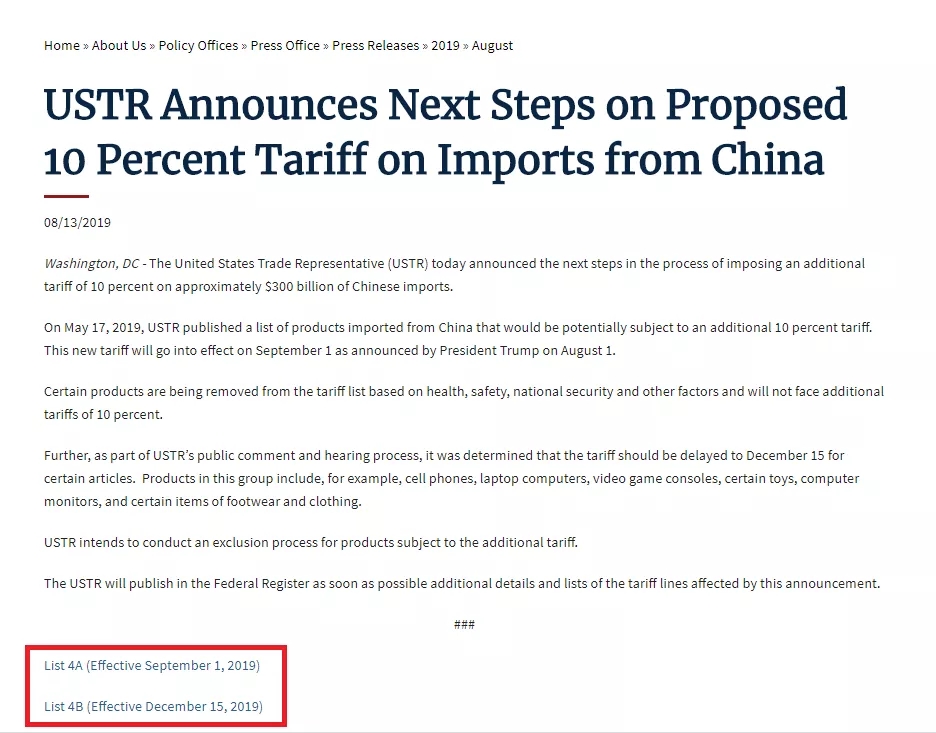 當(dāng)?shù)貢r(shí)間8月13日,美國(guó)貿(mào)易代表辦公室(USTR)官網(wǎng)掛出聲明,公布了接下來(lái)對(duì)中國(guó)輸美產(chǎn)品加征關(guān)稅的相關(guān)計(jì)劃。與此前美方聲稱的9月1日生效日期不同的是,部分對(duì)華關(guān)稅的生效將推遲到12月15日。