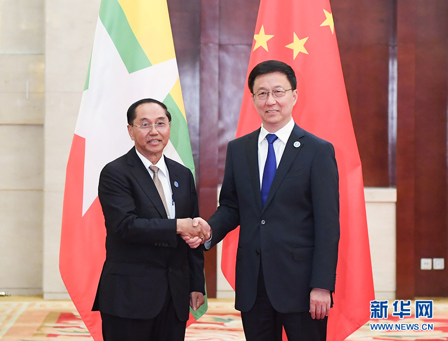 9月20日,中共中央政治局常委、國務院副總理韓正在廣西南寧會見出席第十六屆中國—東盟博覽會和中國—東盟商務與投資峰會的緬甸副總統(tǒng)敏瑞。 新華社記者 申宏 攝