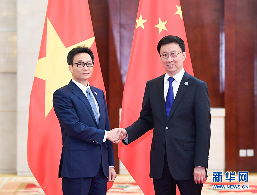9月20日,中共中央政治局常委、國務院副總理韓正在廣西南寧會見出席第十六屆中國—東盟博覽會和中國—東盟商務與投資峰會的越南副總理武德?lián)?新華社記者 申宏 攝