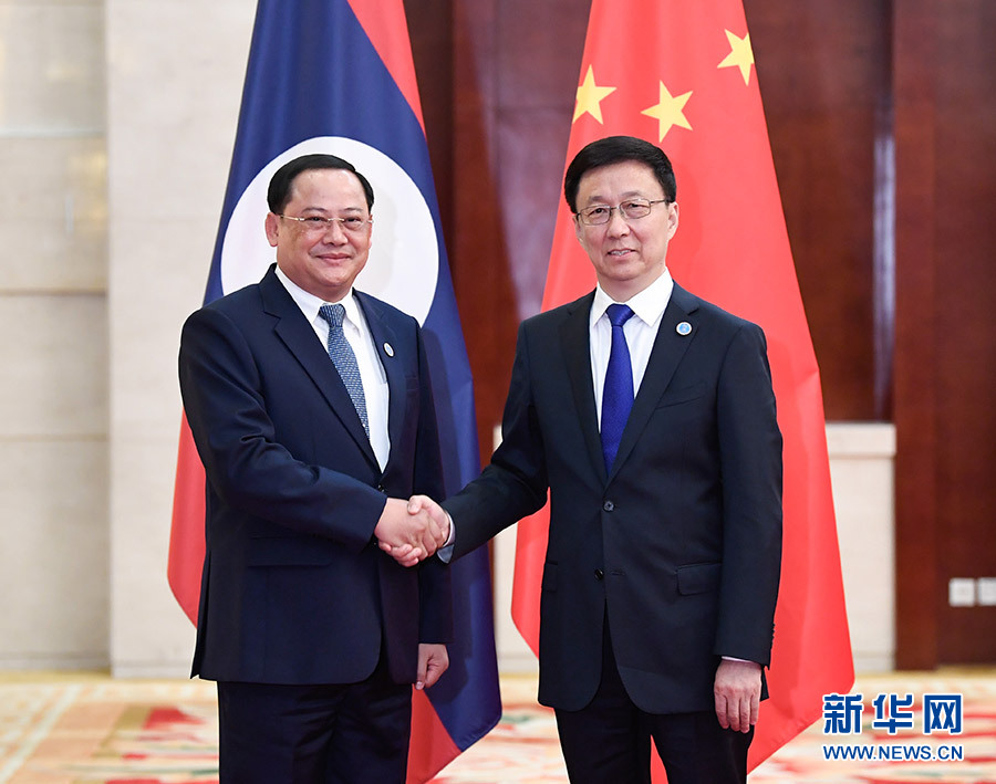 9月20日,中共中央政治局常委、國務院副總理韓正在廣西南寧會見出席第十六屆中國—東盟博覽會和中國—東盟商務與投資峰會的老撾副總理宋賽。 新華社記者 申宏 攝