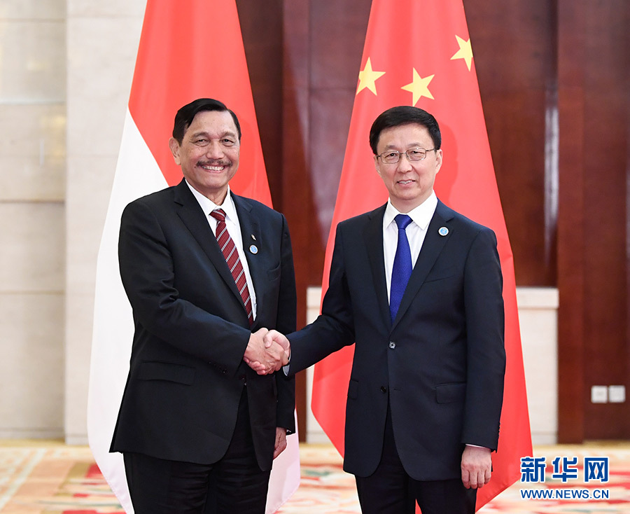 9月20日,中共中央政治局常委、國務院副總理韓正在廣西南寧會見出席第十六屆中國—東盟博覽會和中國—東盟商務與投資峰會的印尼總統(tǒng)特使、海洋統(tǒng)籌部長盧胡特。 新華社記者 申宏 攝