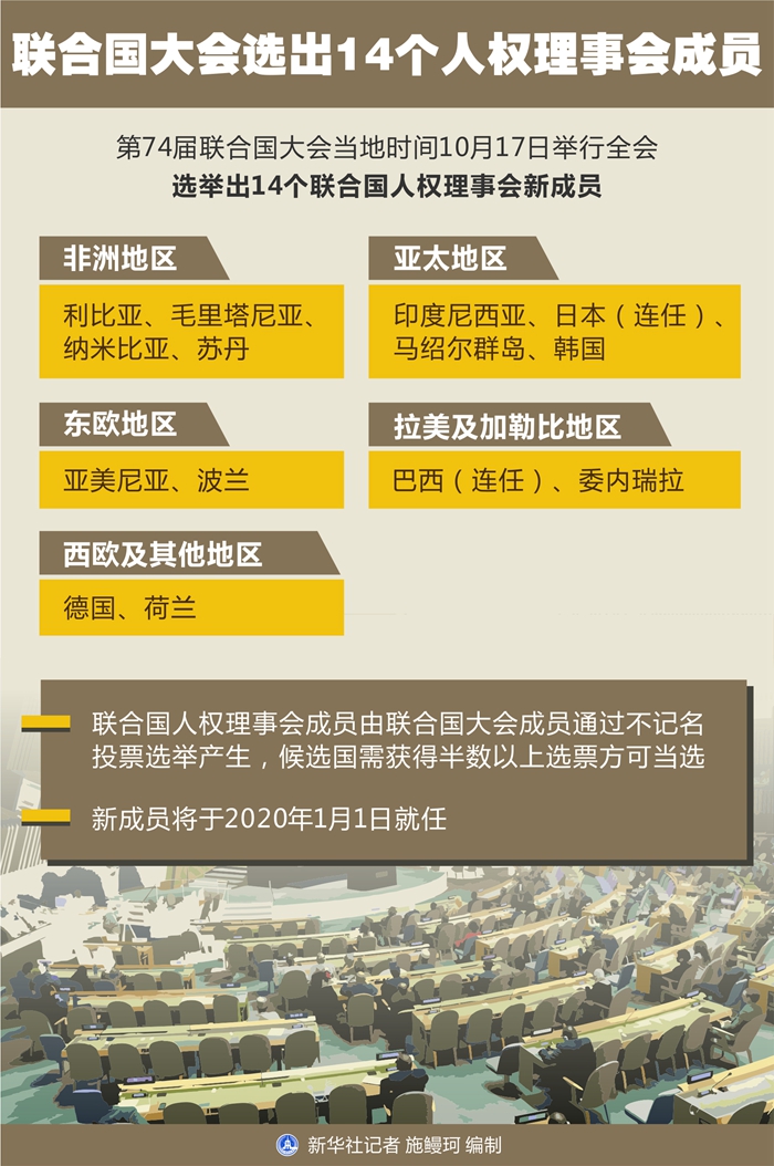 新華社聯(lián)合國(guó)10月17日電(記者尚緒謙)第74屆聯(lián)合國(guó)大會(huì)17日舉行全會(huì),選舉出14個(gè)聯(lián)合國(guó)人權(quán)理事會(huì)新成員,以接替將于今年年底結(jié)束任期的成員。新成員將于2020年1月1日就任。