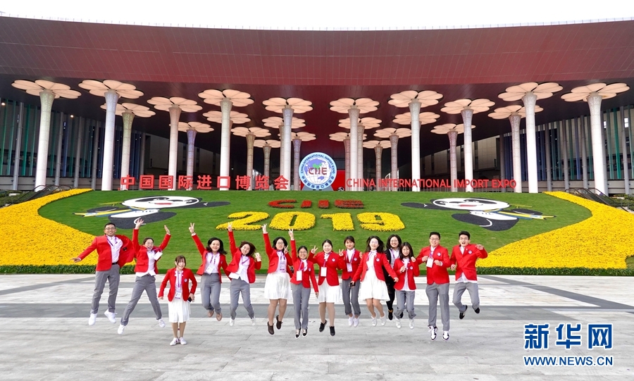 11月4日,第二屆進(jìn)博會(huì)部分志愿者在國(guó)家會(huì)展中心(上海)南廣場(chǎng)合影留念。 第二屆中國(guó)國(guó)際進(jìn)口博覽會(huì)將于11月5日上午在上海開(kāi)幕。 新華社記者 才揚(yáng) 攝