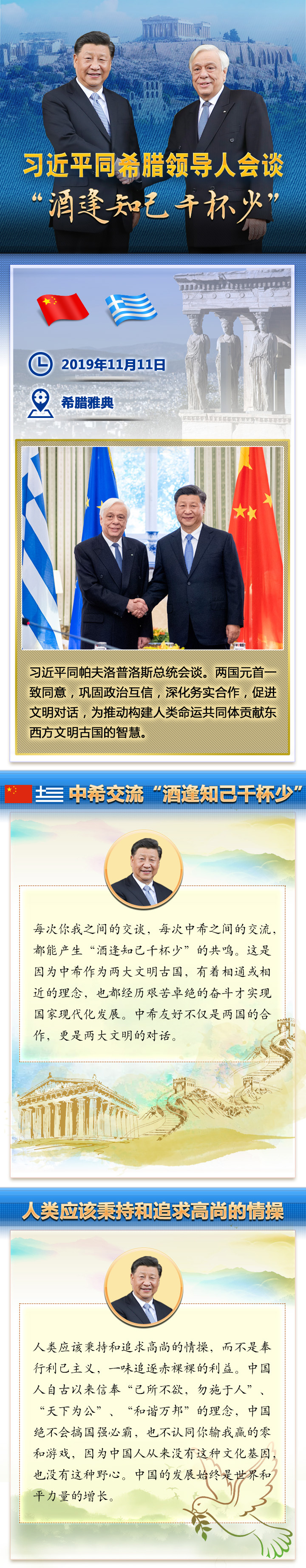 新華社雅典11月12日電 國家主席習(xí)近平11月10日晚抵達雅典,開始對希臘進行國事訪問。11日上午,習(xí)主席的訪問活動異常密集:向希臘無名戰(zhàn)士紀(jì)念碑獻花圈,出席希臘總統(tǒng)帕夫洛普洛斯舉行的隆重歡迎儀式并同帕夫洛普洛斯舉行會談,旋即又同總理米佐塔基斯舉行會談、出席合作文本交換儀式、共同會見記者。中希兩國領(lǐng)導(dǎo)人就雙邊關(guān)系及共同關(guān)心的國際和地區(qū)問題深入交換意見,達成廣泛共識。