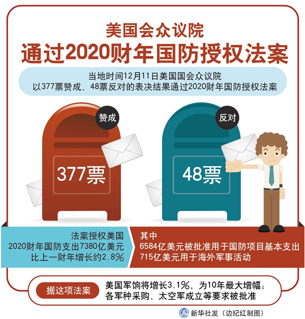 新華社華盛頓12月11日電(記者孫丁 徐劍梅)美國國會眾議院11日以377票贊成、48票反對的表決結(jié)果通過2020財年國防授權(quán)法案。