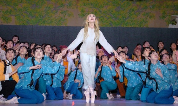 2004年12月28日,為慶祝日本松山芭蕾舞團理事長清水正夫獲得中國“文化交流貢獻獎”,日本松山芭蕾舞團在東京上演現(xiàn)代芭蕾舞劇《白毛女》,第二代白毛女扮演者森下洋子(中)在舞劇《白毛女》中飾演“喜兒”。 新華社記者馬平攝