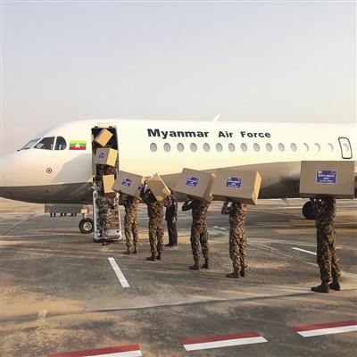 2月25日清晨迎著朝陽,緬甸國防軍使用空軍飛機運送N95級別口罩、護(hù)目鏡、防護(hù)服等醫(yī)療捐助物資前往中國,旨在幫助中國抗擊新冠肺炎疫情,緬甸國防軍總參謀長妙通烏上將、駐緬甸大使陳海、使館武官熊韶?zé)樀仍趦?nèi)比都機場送行。光明日報駐仰光記者鹿鋮攝/光明圖片