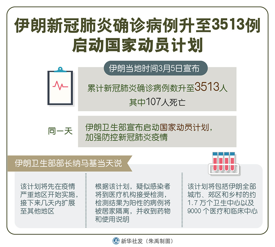新華社德黑蘭3月5日電(記者陳霖)伊朗5日宣布累計新冠肺炎確診病例數(shù)升至3513人。同一天,伊朗衛(wèi)生部宣布啟動國家動員計劃,加強防控新冠肺炎疫情。