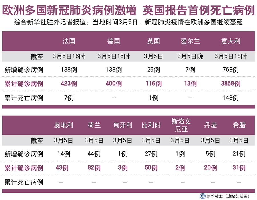 新華社北京3月6日電 綜合新華社駐外記者報(bào)道:5日,新冠肺炎疫情在歐洲多國(guó)繼續(xù)蔓延。除意大利外,法國(guó)和德國(guó)確診病例都有較大幅度增加,英國(guó)報(bào)告首例死亡病例。