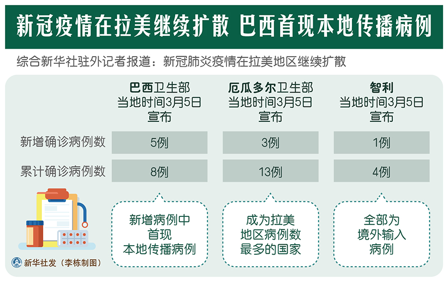 新華社墨西哥城3月5日電? 綜合新華社駐外記者報(bào)道:新冠肺炎疫情在拉美地區(qū)繼續(xù)擴(kuò)散。巴西政府5日宣布該國(guó)首現(xiàn)本地傳播病例,厄瓜多爾、智利和阿根廷確診病例數(shù)量也在增加。拉美多國(guó)紛紛提升防控力度,加強(qiáng)應(yīng)對(duì)措施。