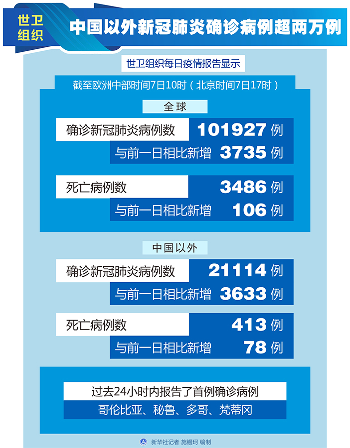 世衛(wèi)組織每日疫情報告顯示,截至歐洲中部時間7日10時(北京時間7日17時),中國以外新冠肺炎確診病例較前一日增加3633例,達(dá)到21114例;死亡病例較前一日增加78例,達(dá)到413例。
