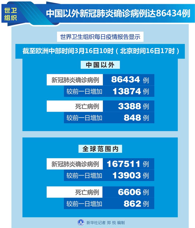 世衛(wèi)組織每日疫情報告顯示,截至歐洲中部時間16日10時(北京時間16日17時),中國以外新冠肺炎確診病例較前一日增加13874例,達到86434例;中國以外死亡病例較前一日增加848例,達到3388例。