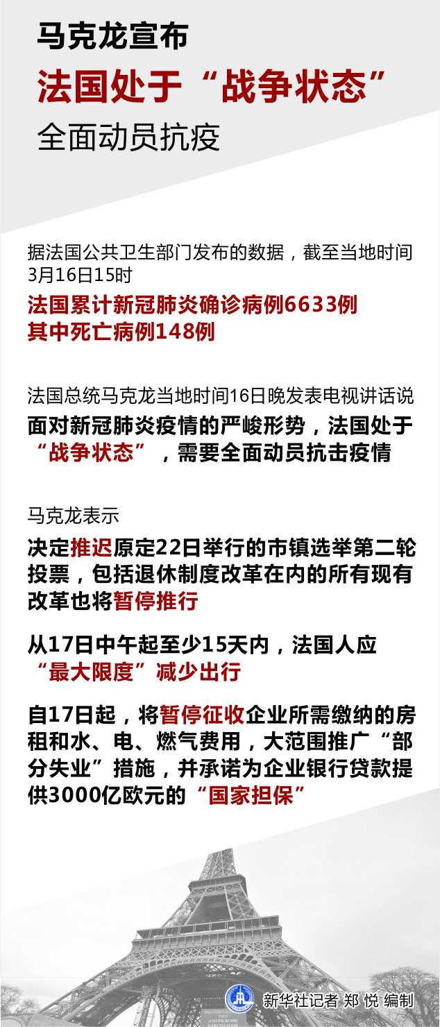 新華社巴黎3月16日電(記者徐永春 唐霽 陳晨)法國(guó)總統(tǒng)馬克龍16日晚發(fā)表電視講話說(shuō),面對(duì)新冠肺炎疫情的嚴(yán)峻形勢(shì),法國(guó)處于“戰(zhàn)爭(zhēng)狀態(tài)”,需要全面動(dòng)員抗擊疫情。