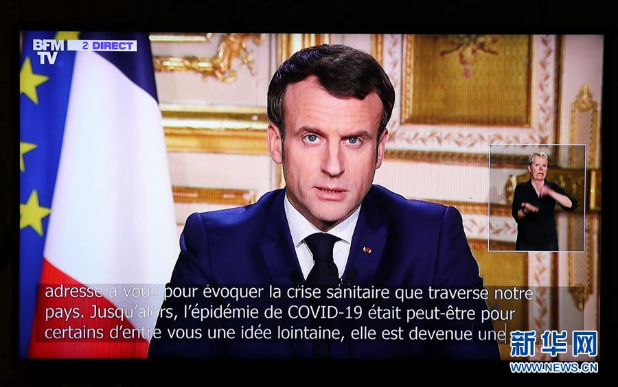 這張電視截屏顯示的是3月16日,法國(guó)總統(tǒng)馬克龍?jiān)诎屠杩偨y(tǒng)府愛(ài)麗舍宮發(fā)表電視講話。 新華社發(fā)