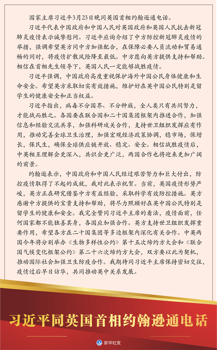 新華社北京3月23日電? 國(guó)家主席習(xí)近平23日晚同英國(guó)首相約翰遜通電話。