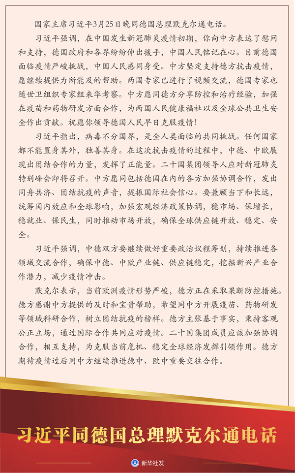 習(xí)近平指出,病毒不分國界,是全人類面臨的共同挑戰(zhàn)。任何國家都不能置身其外,獨(dú)善其身。在這次抗擊疫情的過程中,中德、中歐展現(xiàn)出團(tuán)結(jié)合作的力量,發(fā)揮了正能量。二十國集團(tuán)領(lǐng)導(dǎo)人應(yīng)對新冠肺炎特別峰會即將召開。中方愿同包括德國在內(nèi)的各方加強(qiáng)協(xié)調(diào)合作,發(fā)出同舟共濟(jì)、團(tuán)結(jié)抗疫的聲音,提振國際社會信心。要兼顧當(dāng)下和長遠(yuǎn),統(tǒng)籌國內(nèi)效應(yīng)和全球影響,加強(qiáng)宏觀經(jīng)濟(jì)政策協(xié)調(diào),穩(wěn)市場、保增長,穩(wěn)就業(yè)、保民生,同時推動市場開放,確保全球供應(yīng)鏈開放、穩(wěn)定、安全。