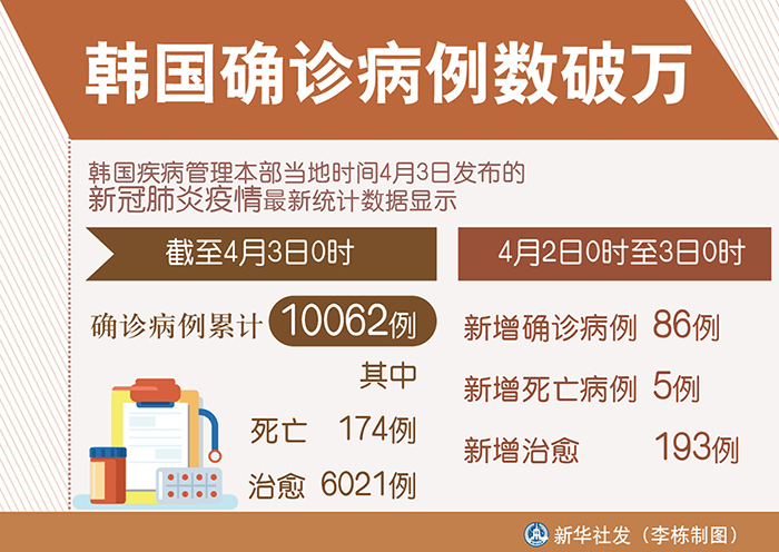 新華社首爾4月3日電(記者陸睿)韓國疾病管理本部3日發(fā)布的新冠肺炎疫情最新統(tǒng)計(jì)數(shù)據(jù)顯示,截至3日0時(shí),韓國確診病例累計(jì)達(dá)10062例,其中死亡174例,治愈6021例。