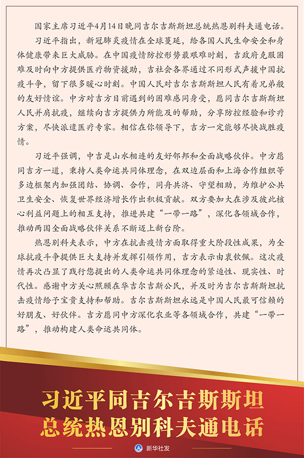 習(xí)近平指出,新冠肺炎疫情在全球蔓延,給各國人民生命安全和身體健康帶來巨大威脅。在中國疫情防控形勢最艱難時刻,吉政府克服困難及時向中方提供醫(yī)療物資援助,吉社會各界通過不同形式聲援中國抗疫斗爭,留下很多暖心時刻。中國人民對吉爾吉斯斯坦人民有著兄弟般的友好情誼。中方對吉方目前遇到的困難感同身受,愿同吉爾吉斯斯坦人民并肩抗疫,繼續(xù)向吉方提供力所能及的幫助,分享防控經(jīng)驗和診療方案,盡快派遣醫(yī)療專家。相信在你領(lǐng)導(dǎo)下,吉方一定能夠盡快戰(zhàn)勝疫情。