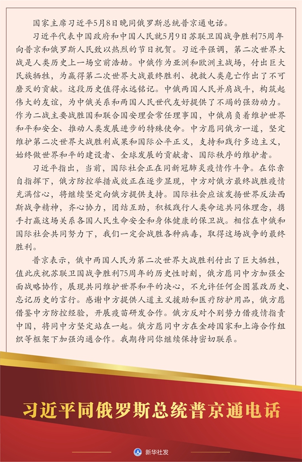新華社北京5月8日電? 國家主席習(xí)近平5月8日晚同俄羅斯總統(tǒng)普京通電話。